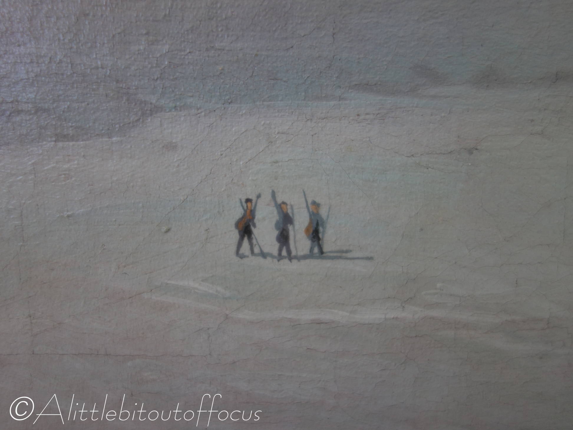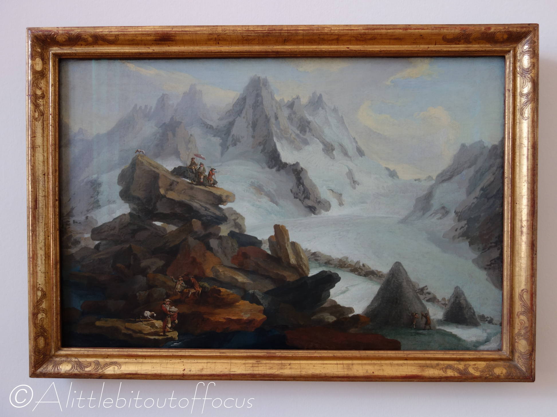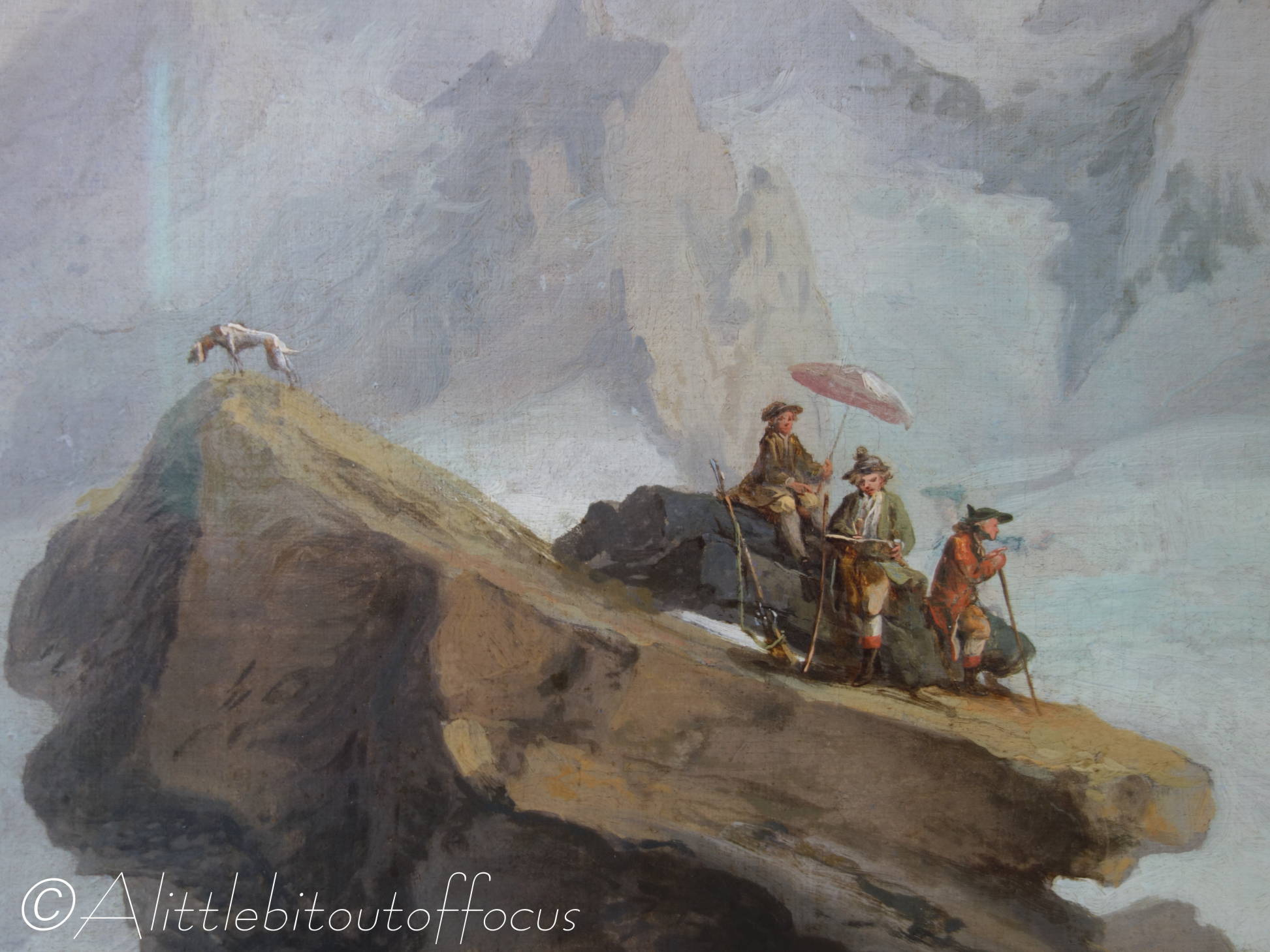 As you will see from my selection of photos below, I often find the detail of some paintings more fascinating than the overall images themselves! For example, I was particularly amused by the 3 tiny people standing on the glacier in the painting of the Finsteraarhorn by Kaspar Wolf. (See pic no. 7). It looks like one of them might be waving. Kaspar obviously had a great sense of humour as the 3 people sitting on the rock in the next painting look incredibly relaxed for such a precarious position.