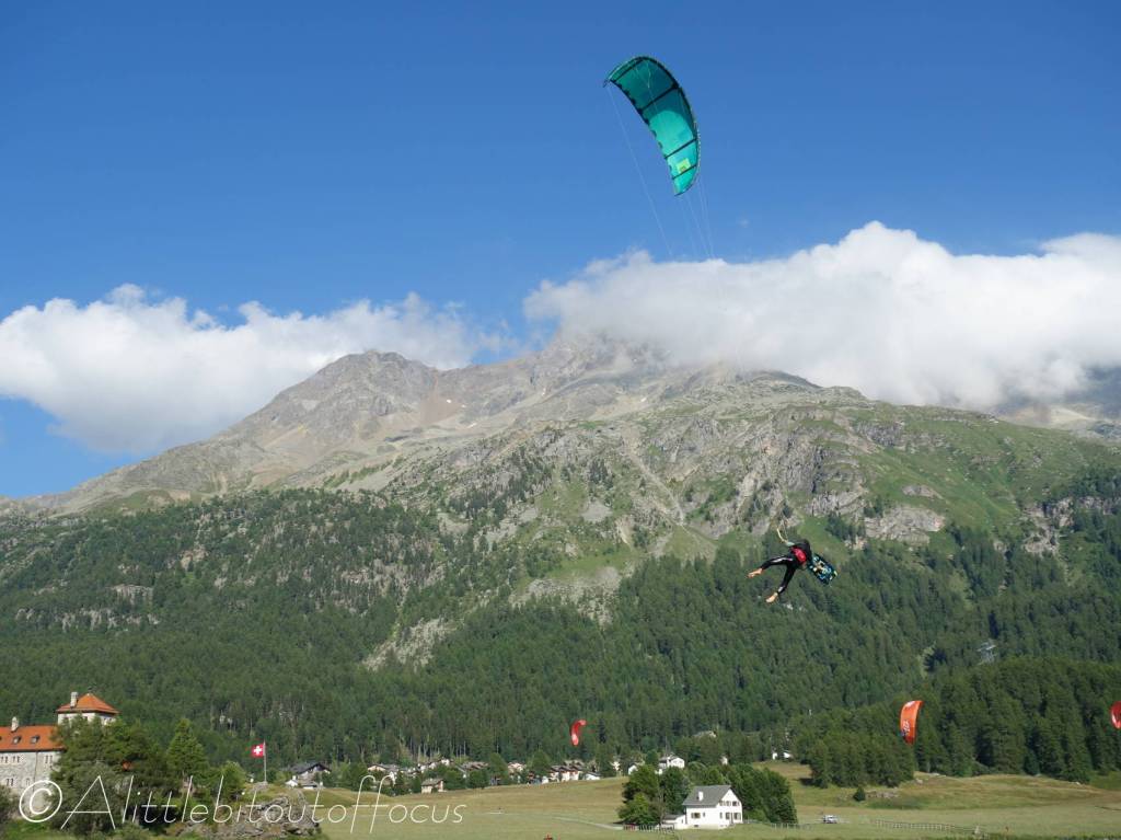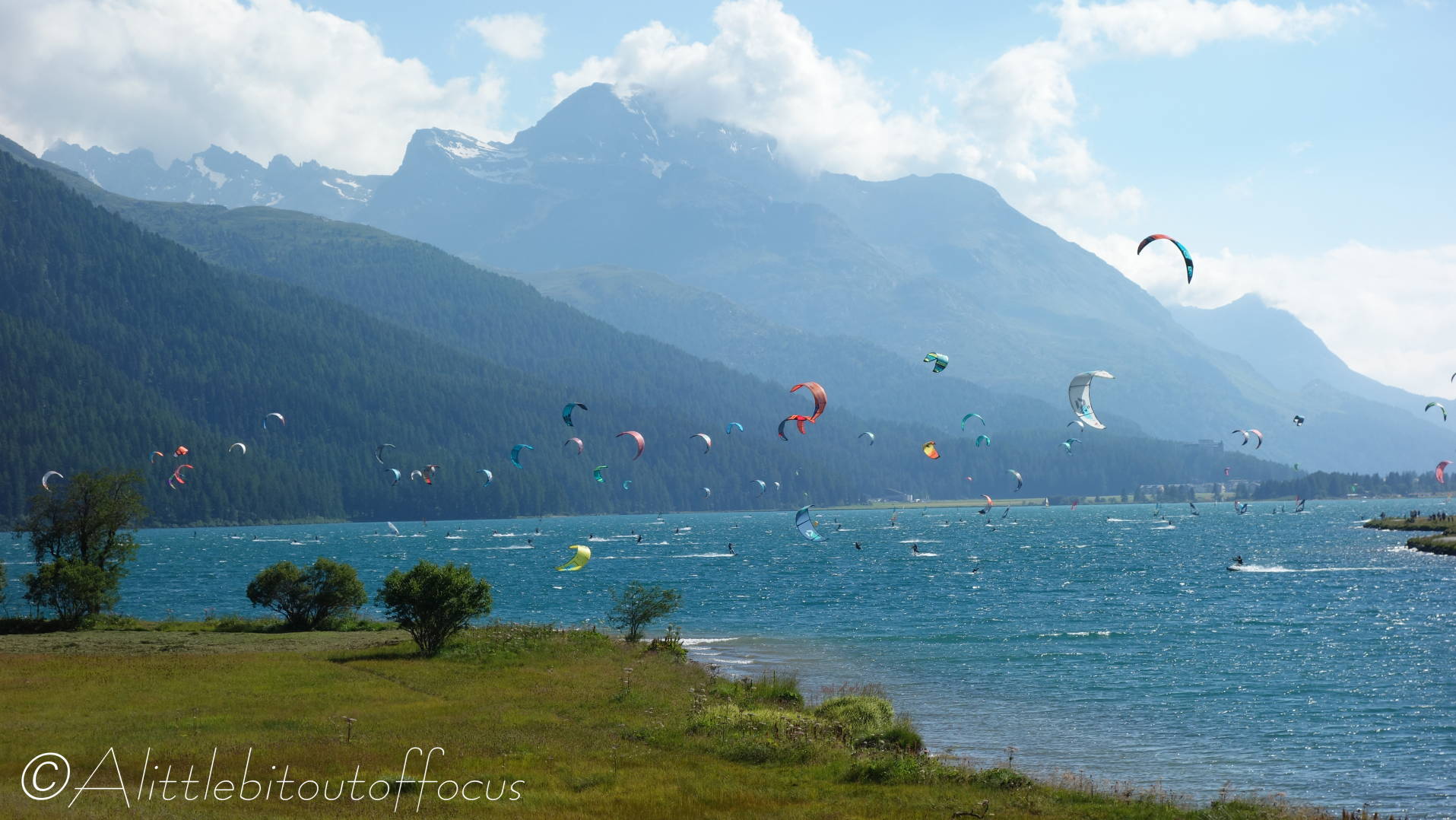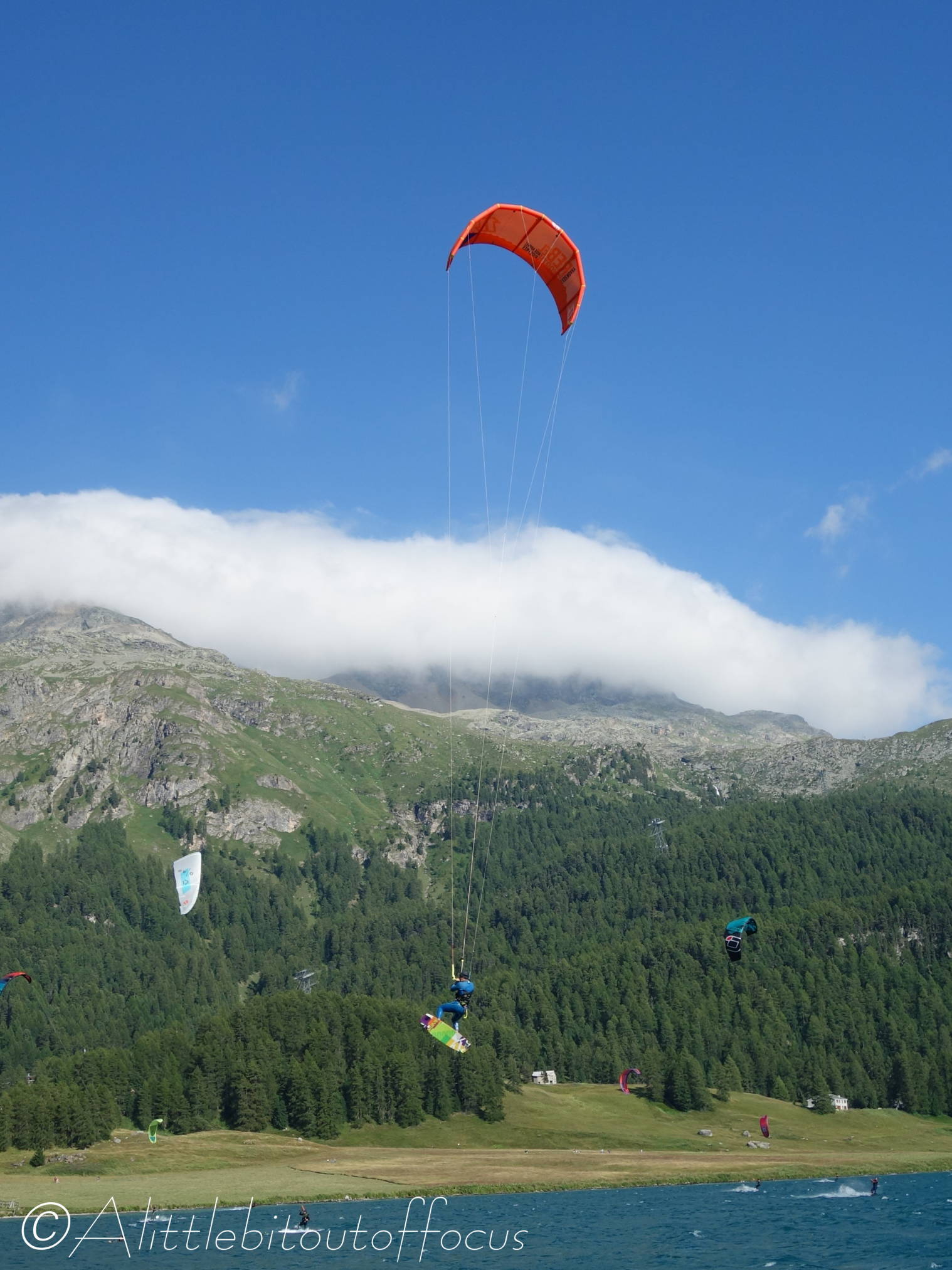 As we drove back from Diavolezza, we came across one of the most amazing, certainly sporting, sights that I have ever seen. There must have been at least 50 or 60 kite-surfers, criss-crossing the Silvaplanasee. After the extremely calm morning, the wind had picked up and the surfers were having a fantastic time – some leaping high into the air and landing gracefully, but occasionally trying some tricks (like removing the board from their feet) and then, more often than not, crashing back into the lake.