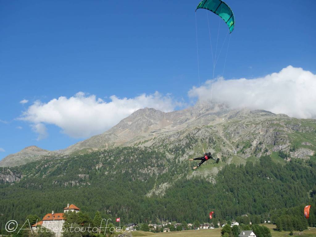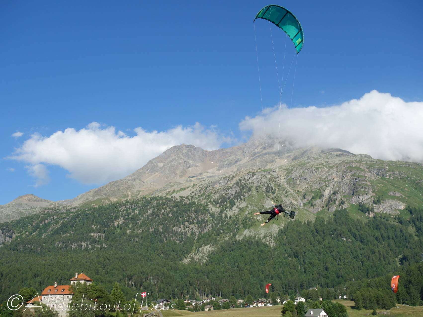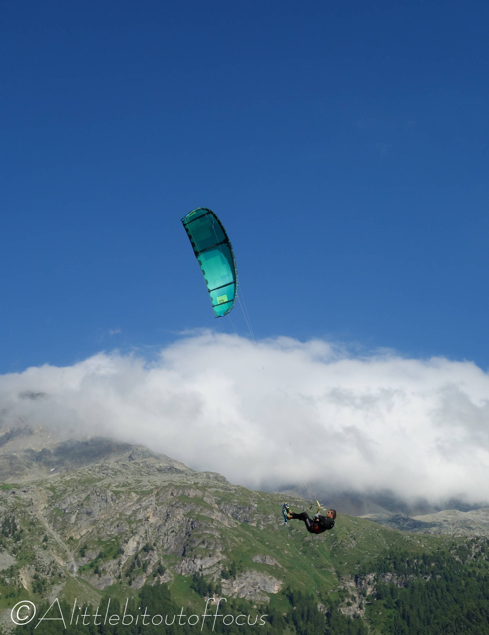 As we drove back from Diavolezza, we came across one of the most amazing, certainly sporting, sights that I have ever seen. There must have been at least 50 or 60 kite-surfers, criss-crossing the Silvaplanasee. After the extremely calm morning, the wind had picked up and the surfers were having a fantastic time – some leaping high into the air and landing gracefully, but occasionally trying some tricks (like removing the board from their feet) and then, more often than not, crashing back into the lake.