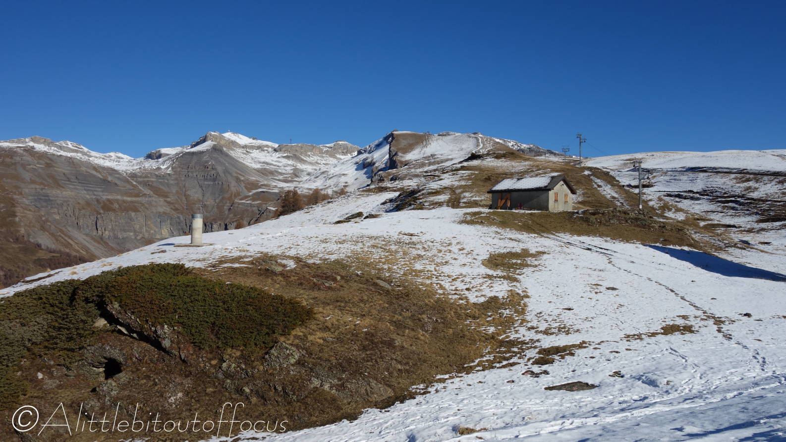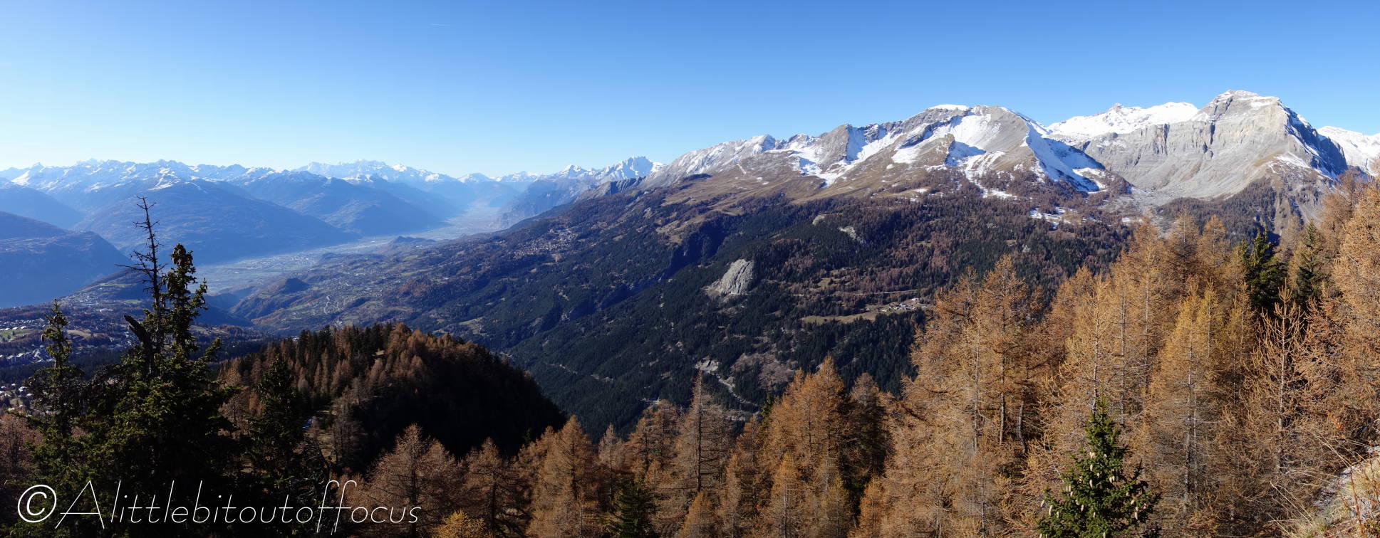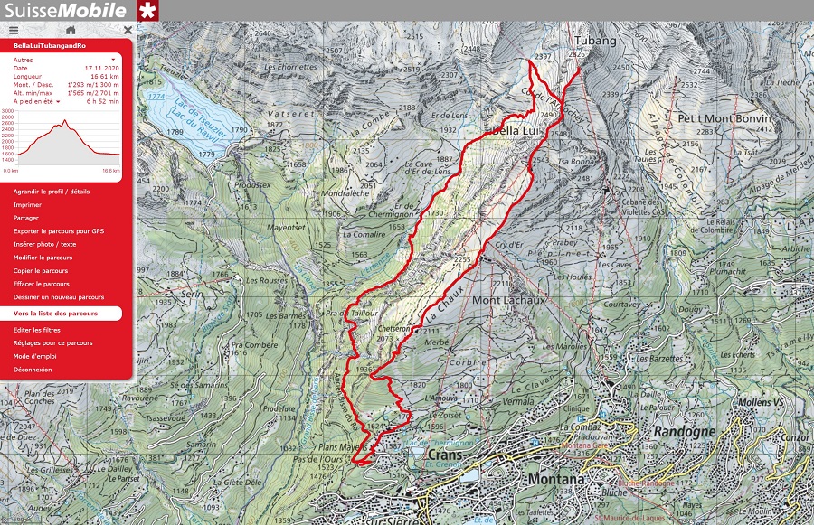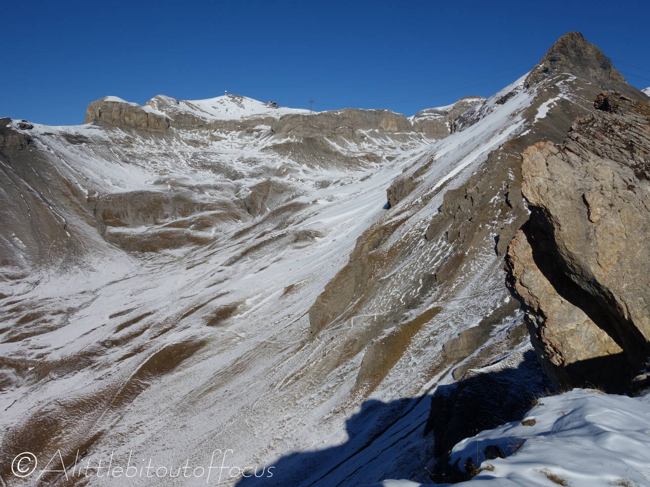 We had a small amount of rain on Monday night which left a layer of snow down to around 2,300m or 7,500ft. With this in mind I scoured the map for something new and south facing, as the snow may well have melted away. I settled upon a walk above Crans-Montana to Bella Lui (at 2,548m or 8,360ft), with the possibility of carrying on to a peak called Tubang (at 2,826m or 9,272ft), if the snow conditions allowed. I also noticed that there was a return path from the Col de l’Arpochey, which sits between the two peaks, that would take me down to the Bisse de Ro and back to the parking area.