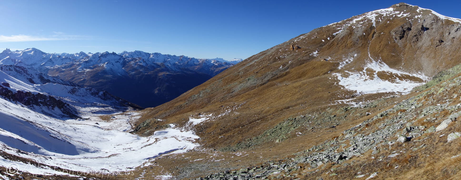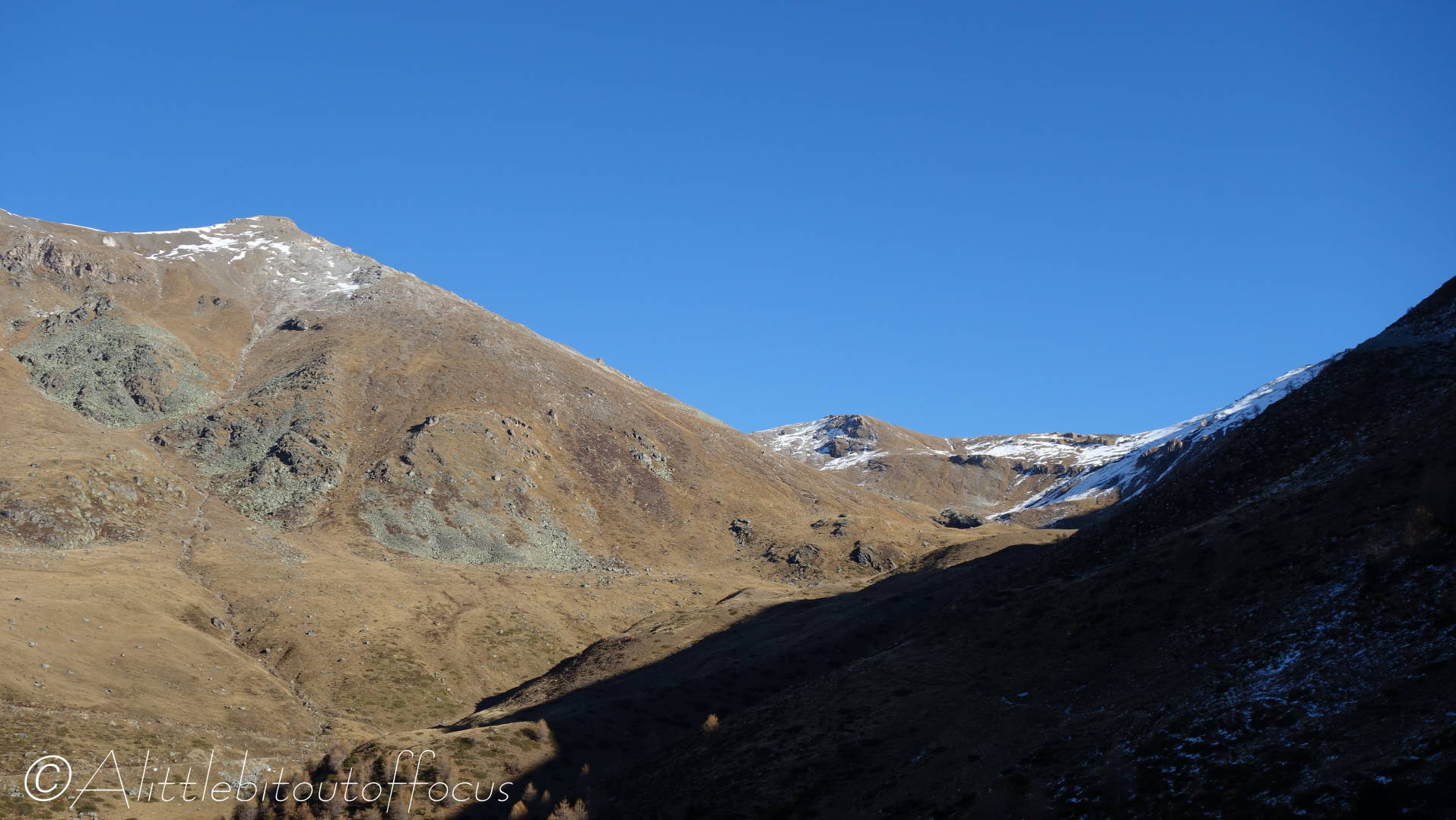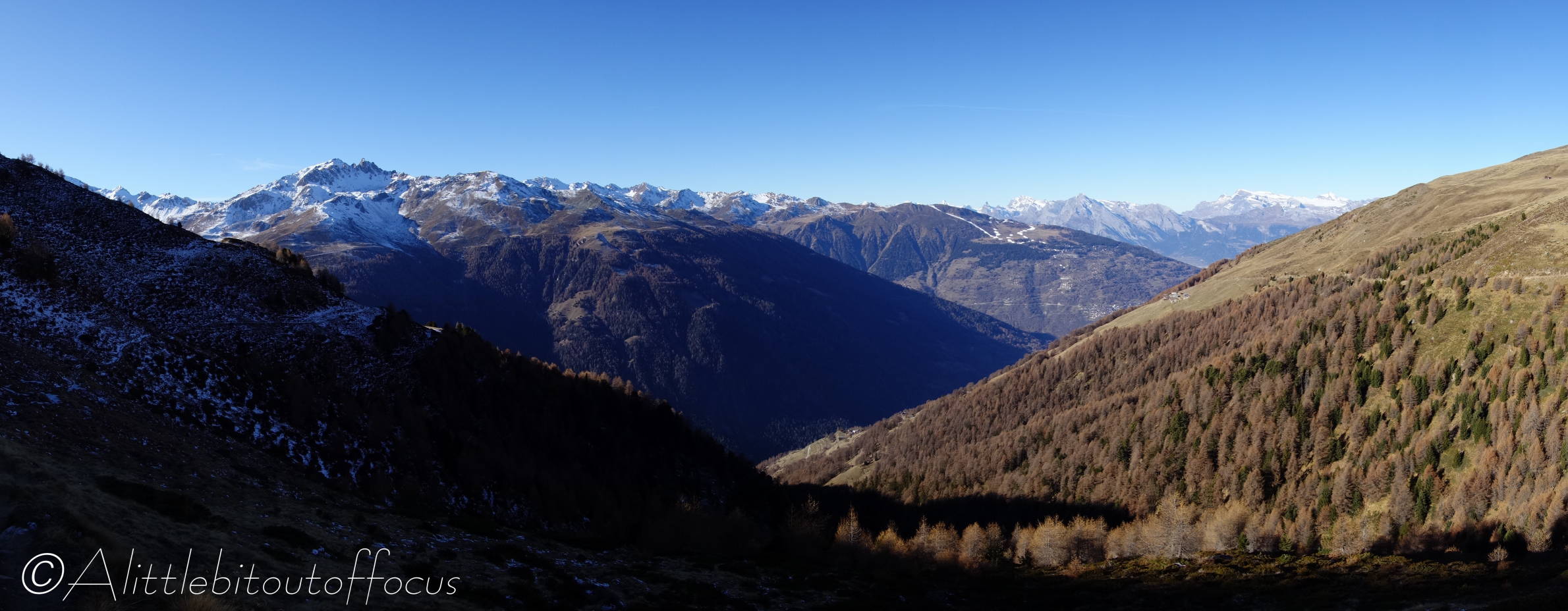 I eventually reached the col and was rewarded with a magnificent view over the Grimentz valley (pic 24). The other hiker was already there and he’s again visible in pic 22. I walked a little further across, through varying depths of snow (maybe 15cm to 40cm or 6″ to 16″) due to the drifts and was pleased to take a few pictures of the cross at the top with just my footsteps. (See pic 23). It was rather strange to see the ground completely covered in snow in one direction, but almost free of snow in another.