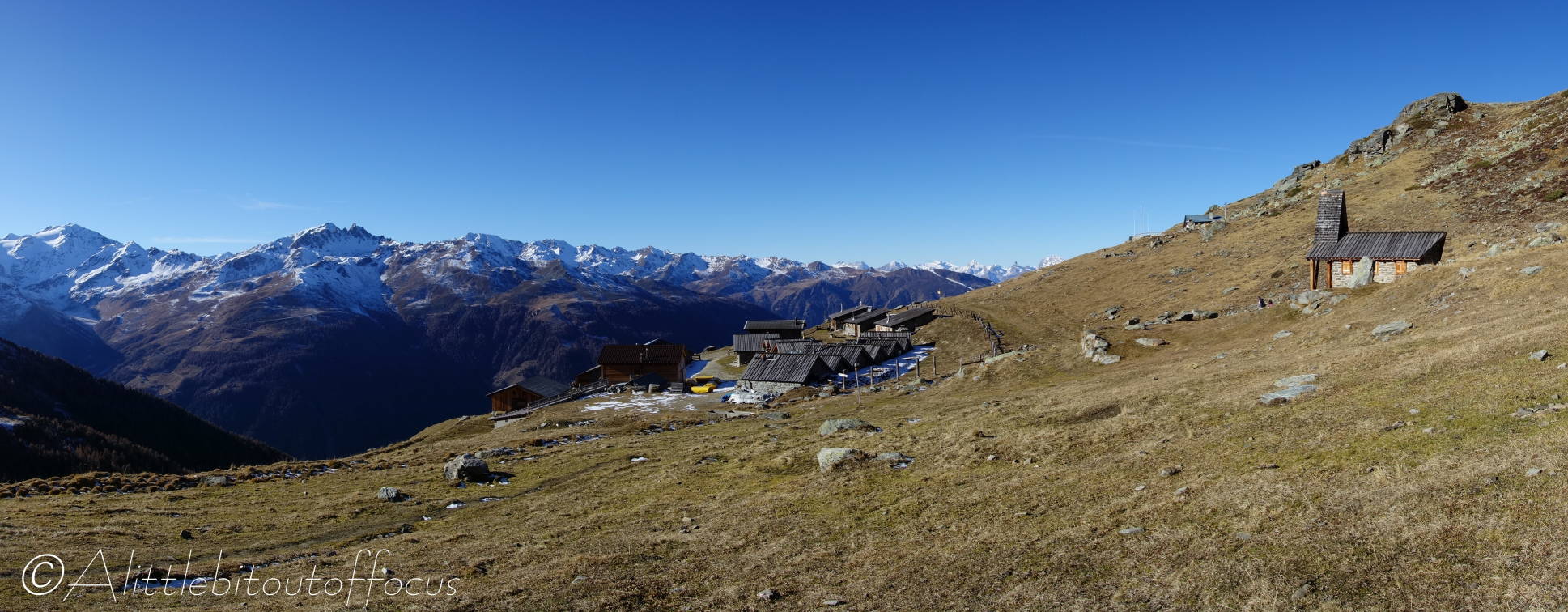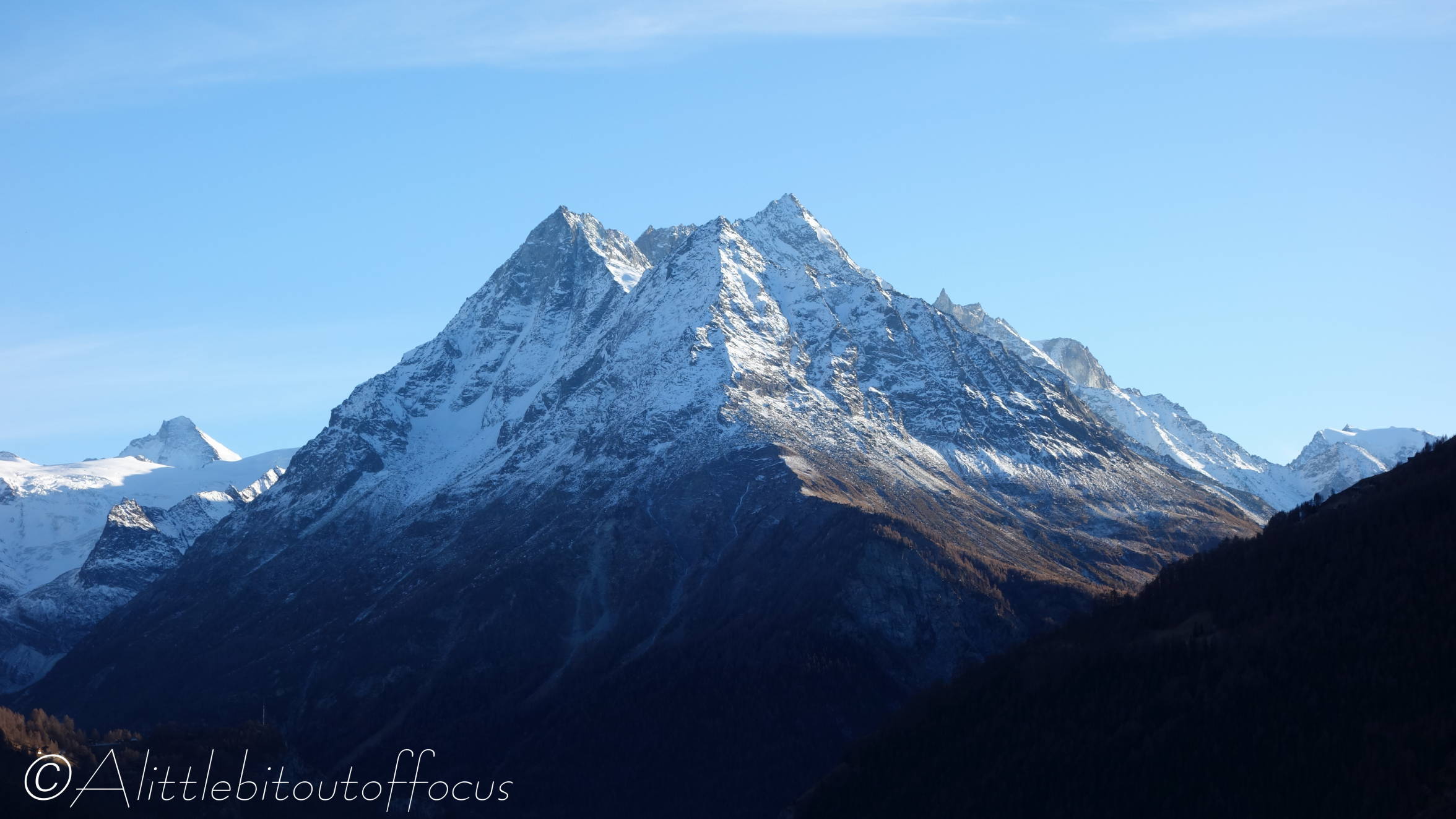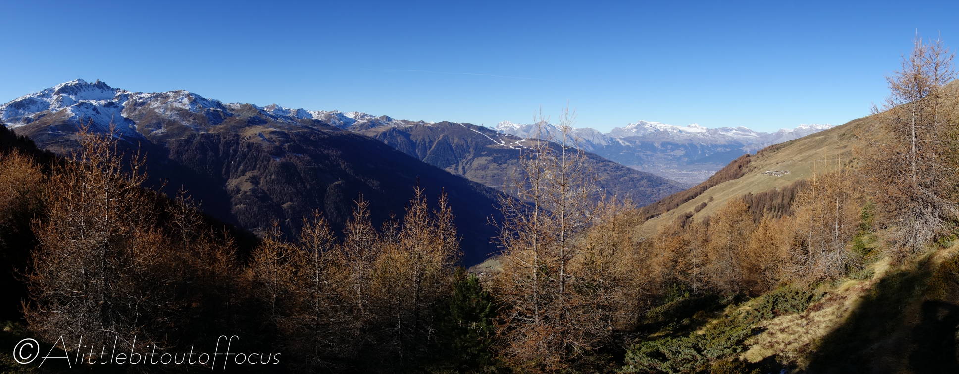I eventually reached the col and was rewarded with a magnificent view over the Grimentz valley (pic 24). The other hiker was already there and he’s again visible in pic 22. I walked a little further across, through varying depths of snow (maybe 15cm to 40cm or 6″ to 16″) due to the drifts and was pleased to take a few pictures of the cross at the top with just my footsteps. (See pic 23). It was rather strange to see the ground completely covered in snow in one direction, but almost free of snow in another.