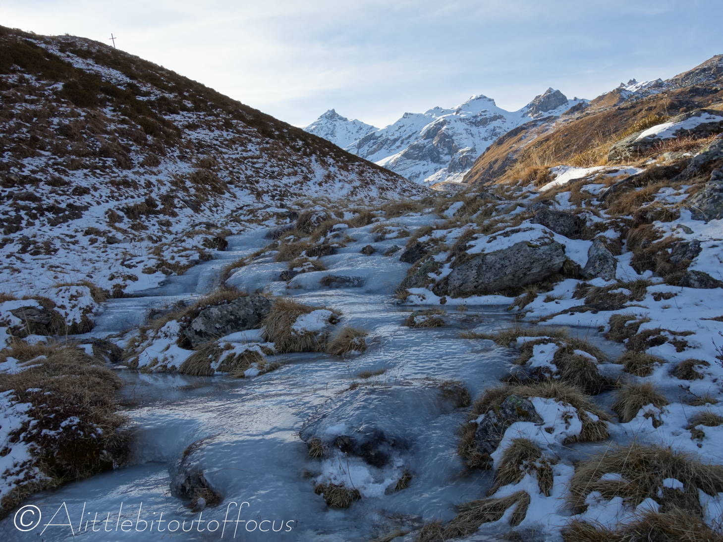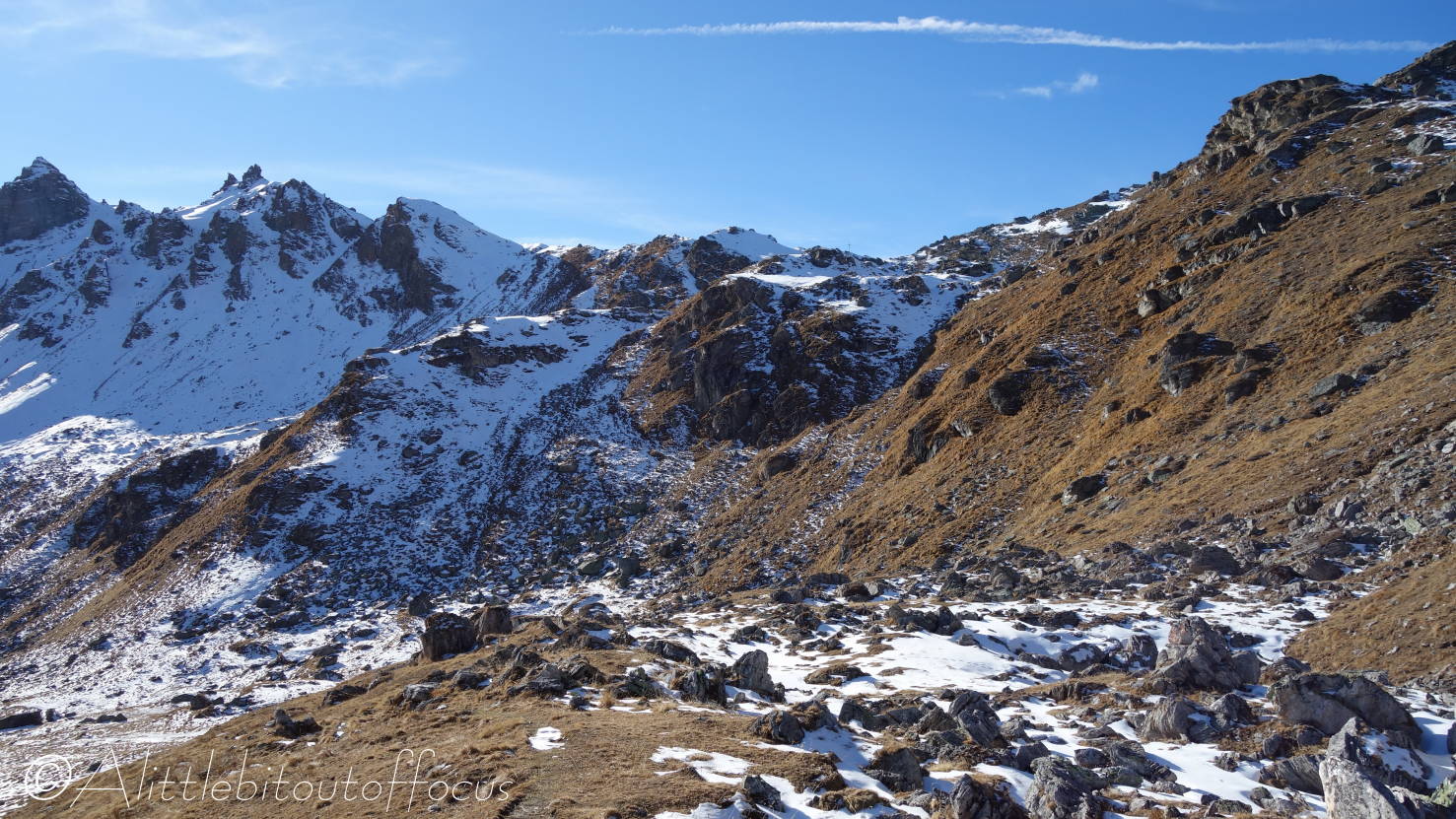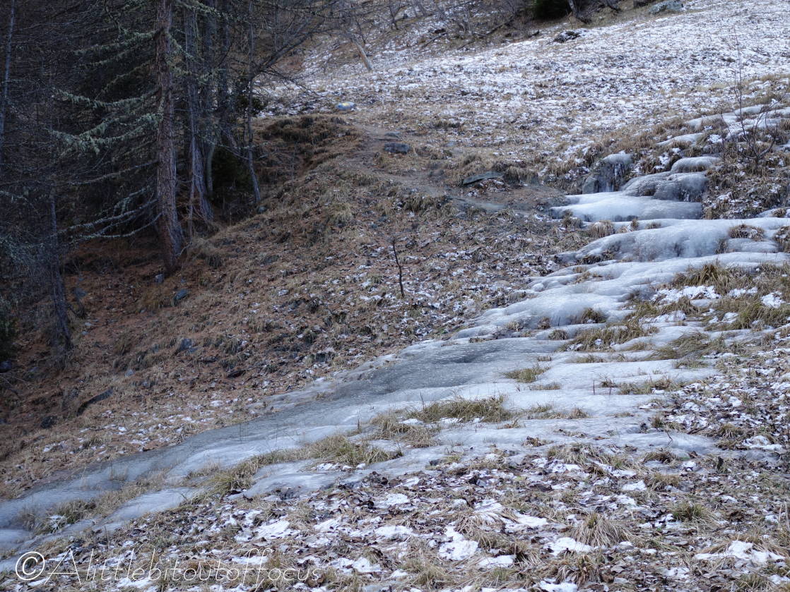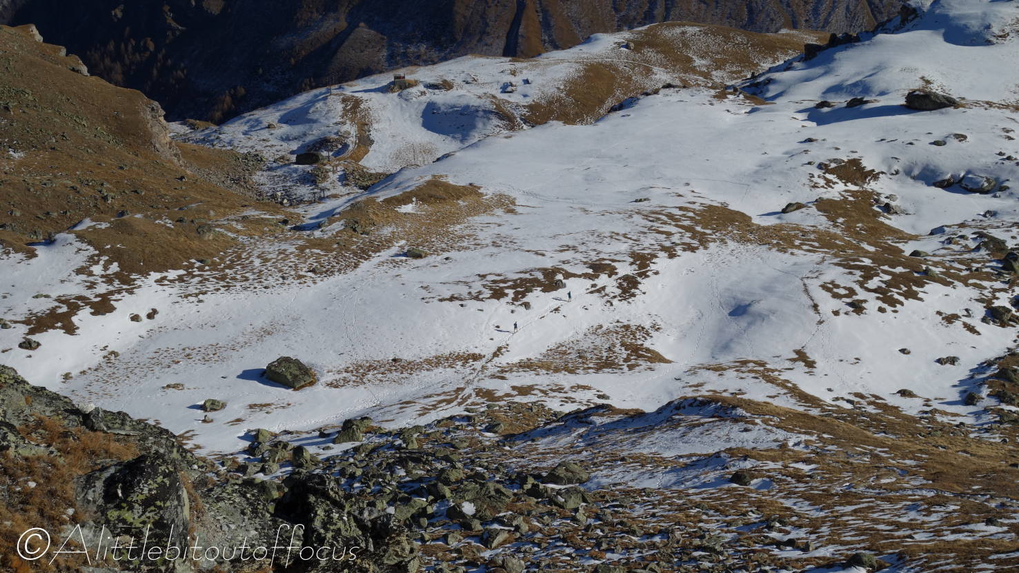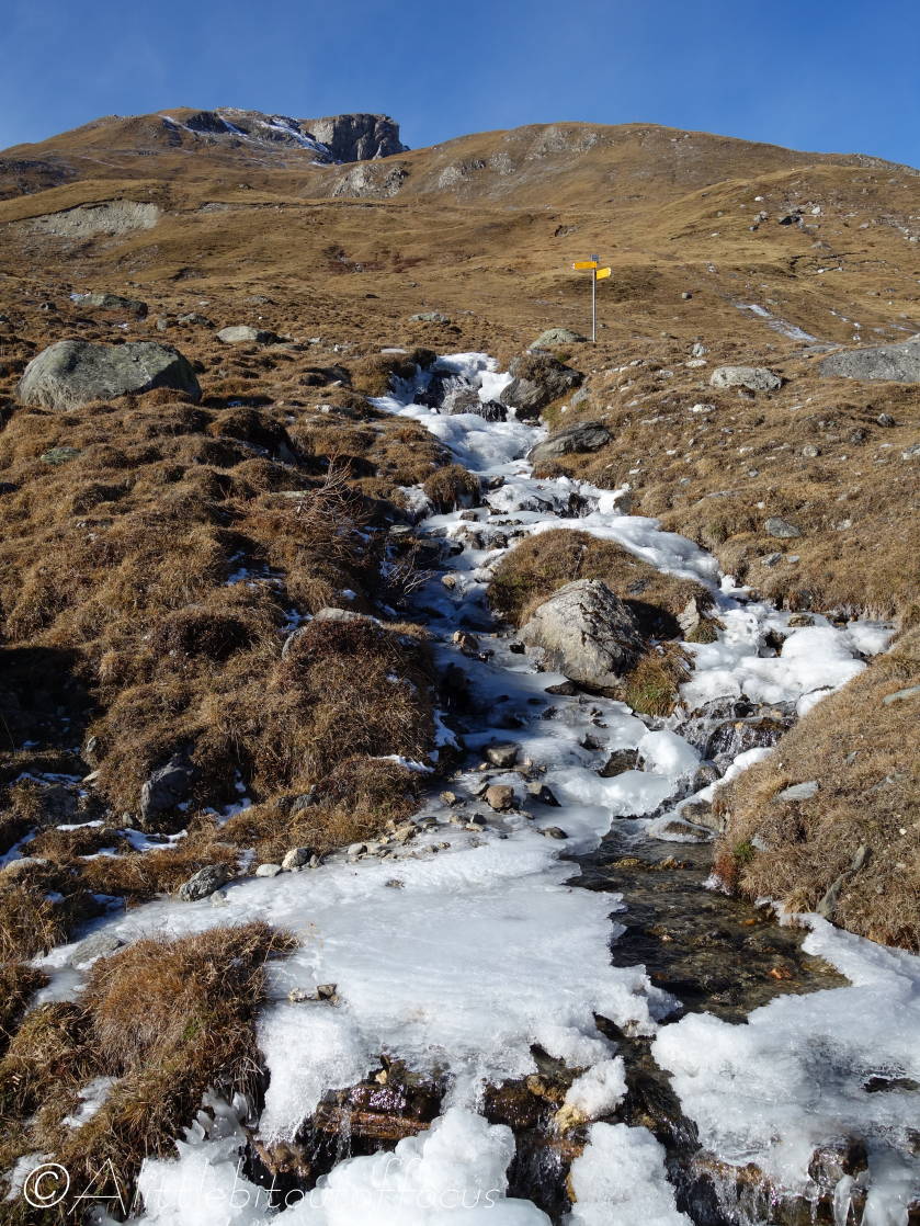 As you will see from the gallery of photos, it was a rather a cold morning and many of the streams were completely frozen. As I approached the Pas d’Arpilles, two young guys appeared behind me and went passed in the blink of an eye. After exchanging pleasantries (in French) I caught up with them again just below the Col de la Meina. (They’d stopped to make a phone call). After another brief discussion in (my very poor) French, I heard one of them speak to the other in English. It turned out that they were British! (Both lawyers working in Geneva). You can see Sam and Alistair (my apologies if that’s Alastair) in pictures 16 and 23-25 below.