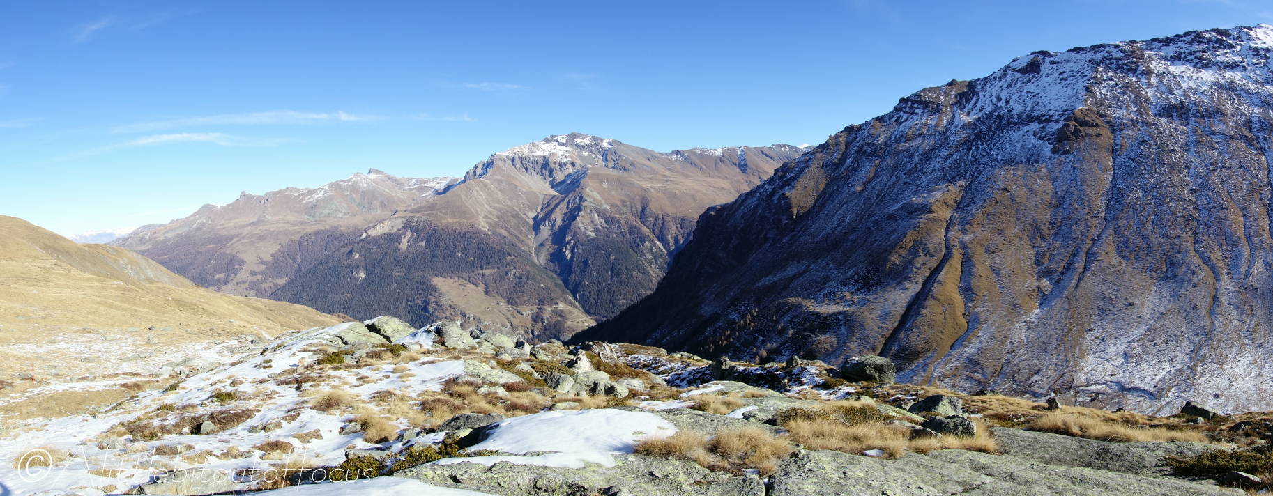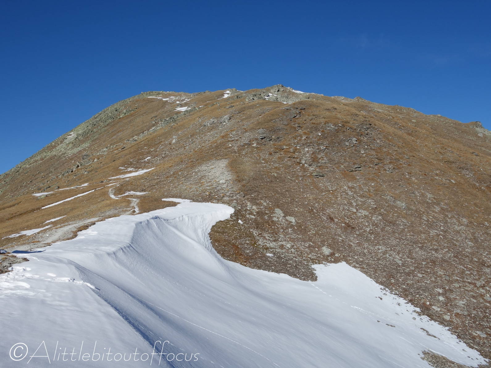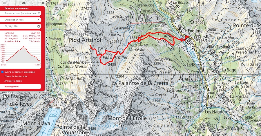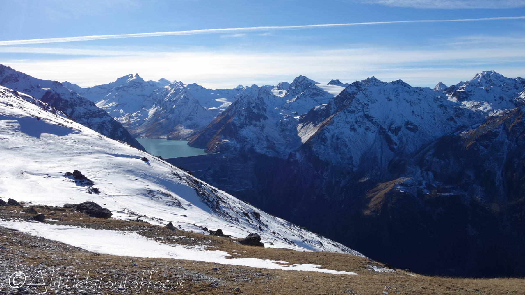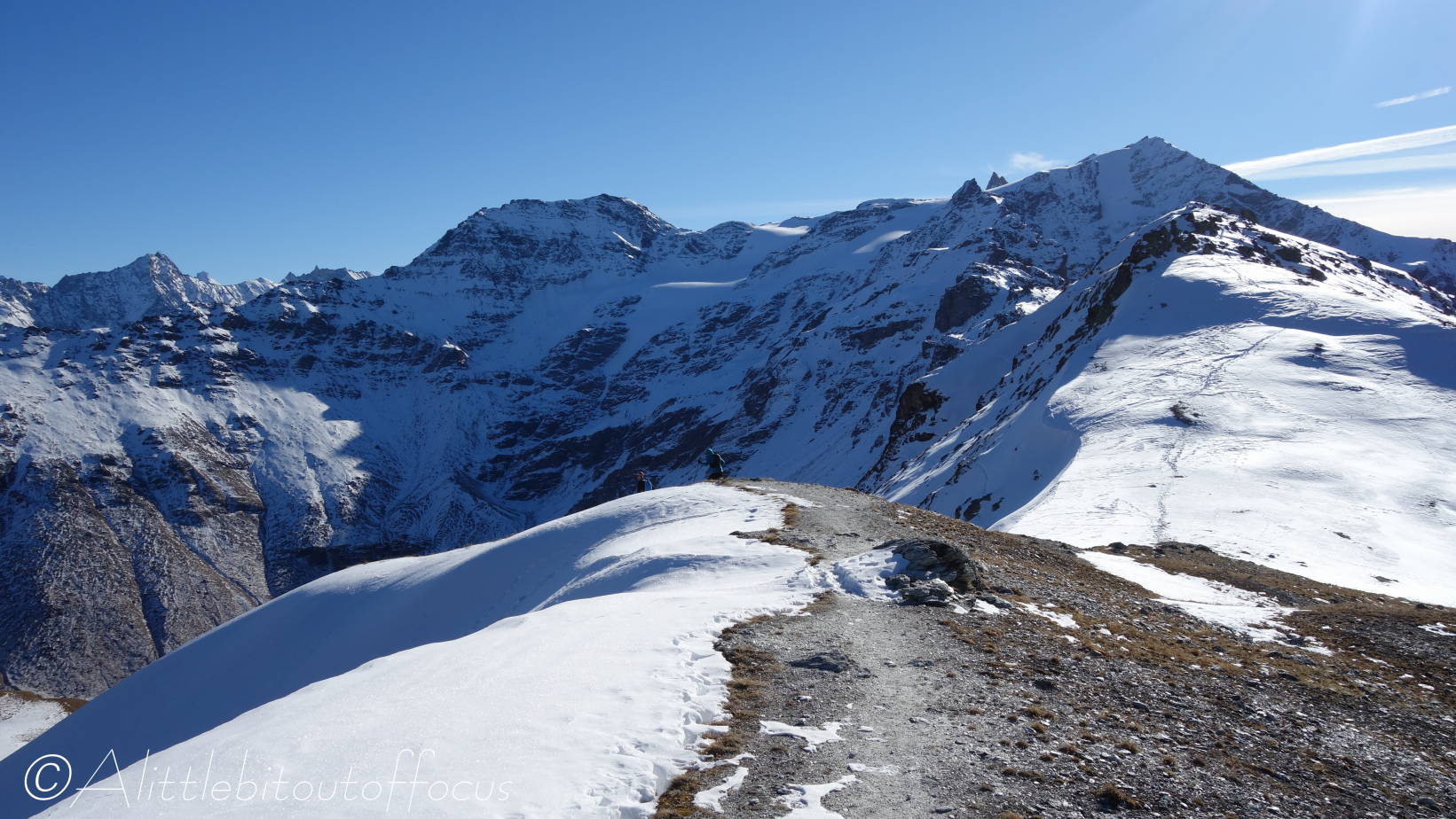 As you will see from the gallery of photos, it was a rather a cold morning and many of the streams were completely frozen. As I approached the Pas d’Arpilles, two young guys appeared behind me and went passed in the blink of an eye. After exchanging pleasantries (in French) I caught up with them again just below the Col de la Meina. (They’d stopped to make a phone call). After another brief discussion in (my very poor) French, I heard one of them speak to the other in English. It turned out that they were British! (Both lawyers working in Geneva). You can see Sam and Alistair (my apologies if that’s Alastair) in pictures 16 and 23-25 below.