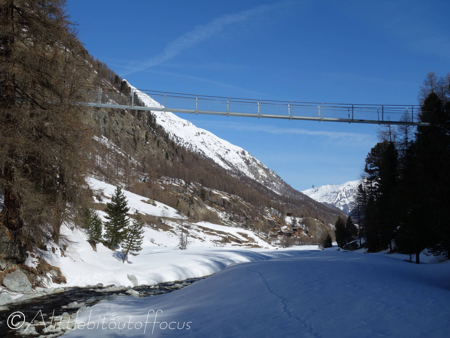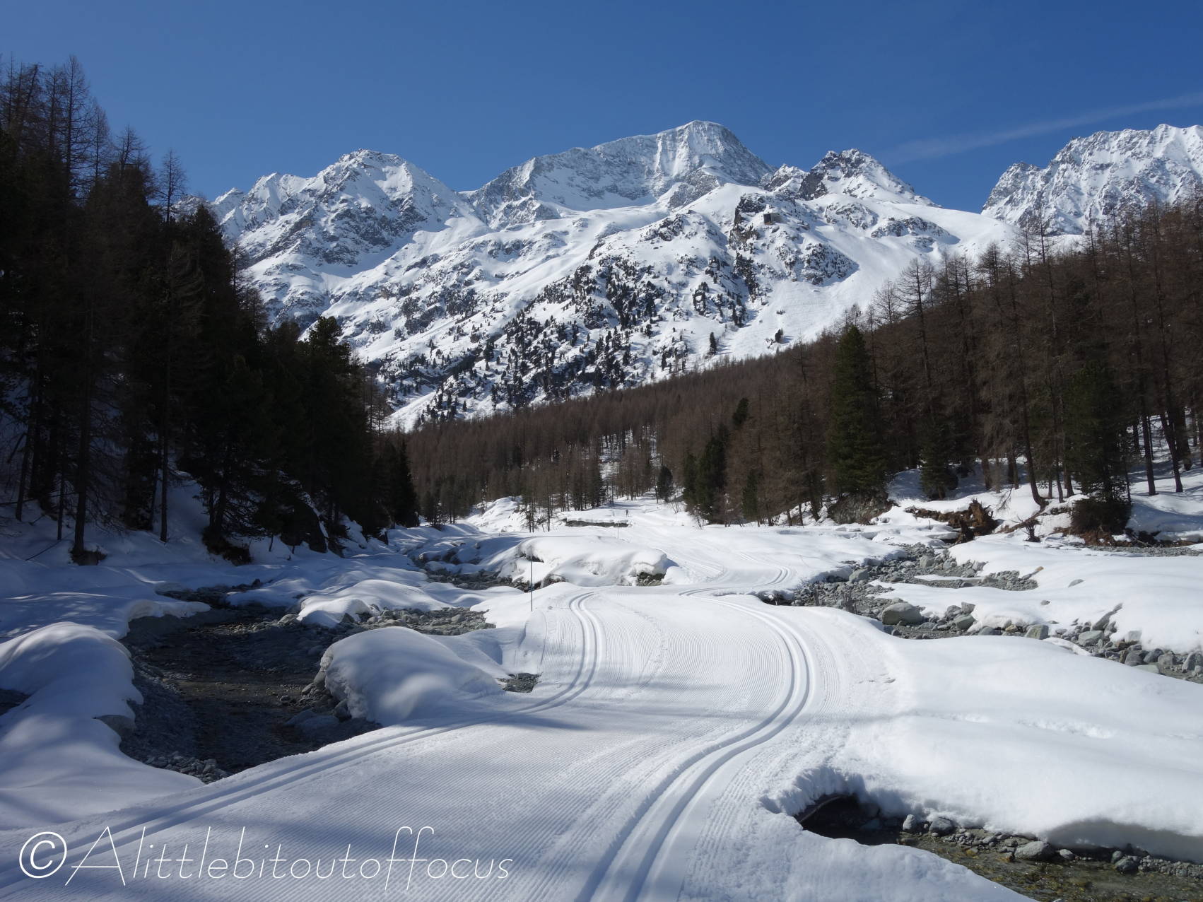 “What now?” I thought to myself and, rather than walk back along the road, I headed across to the other side of the river and followed the snow-shoeing route, before taking a rather cheeky short cut across the cross-country piste back to Arolla. At least it gave me the chance to take some more photos for you. 😊