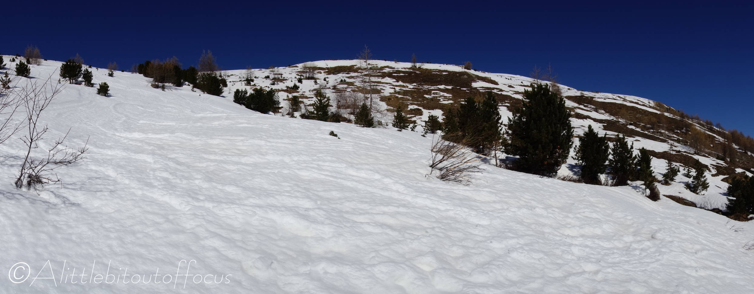 After more zig-zagging through the trees, I came to another gully. And the view back down to Satarma (pic 16) looked infinitely more appealing than another 20 minutes or more working my way around to what might have been a good path to Lac Bleu and then a descent to La Gouille and Satarma. So that’s what I did, I ‘walked’ (more like, stumbled) down the snowy slope, sometimes ankle deep, sometimes knee deep and more than once up to my thighs. Twice I got myself stuck, where I couldn’t move either leg, but luckily there was a branch nearby to help haul myself upright and out.
