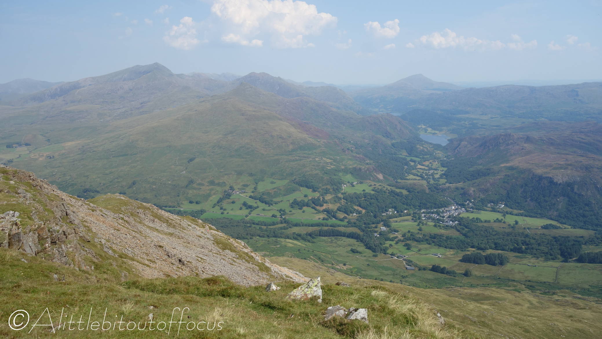 The route follows the east side of the river (or afon) Glaslyn to the quaint little village of Beddgelert (which was packed with tourists) before heading almost directly up to the summit. From the top, with my binoculars, I could just about make out our house through the heat haze, but the views in all directions were fantastic. Not only that but, while I sat and ate my lunch, I was treated to a fly past by a red kite and several Wall Browns living up to their names on the dry stone wall leading up to the summit cairn.