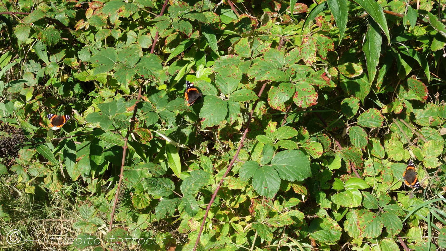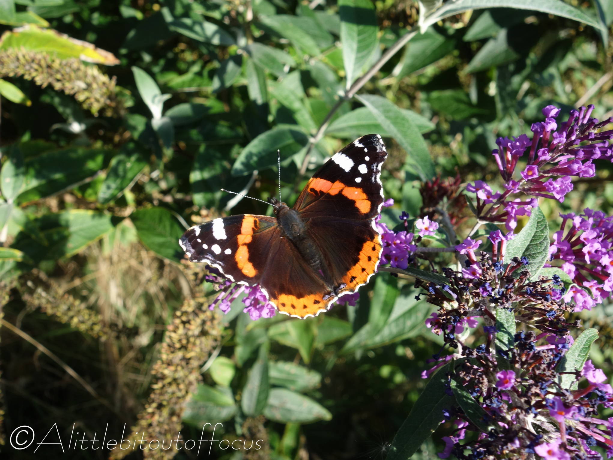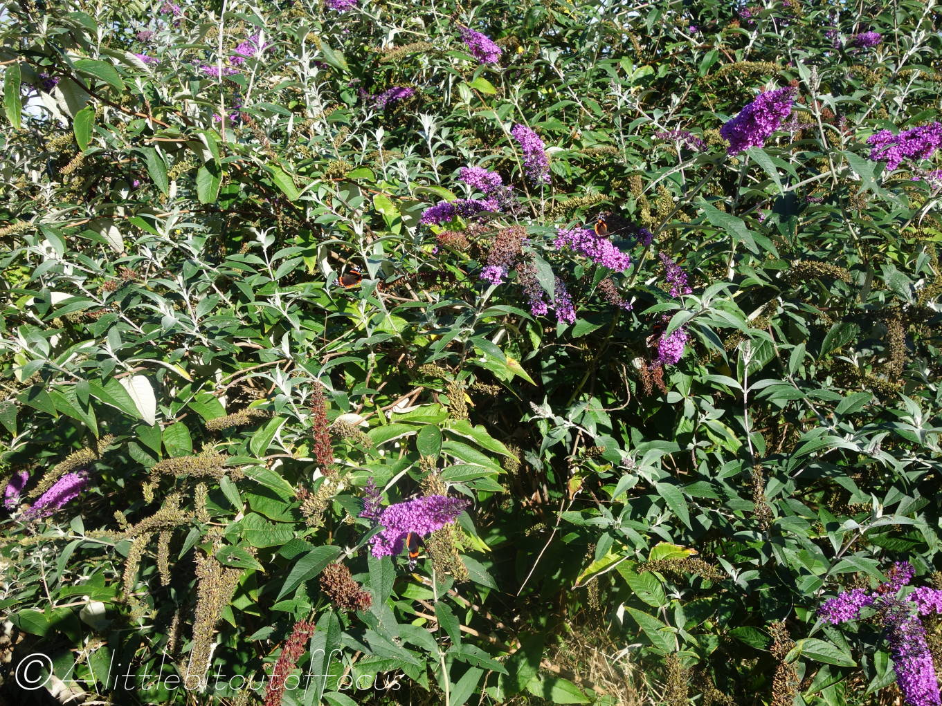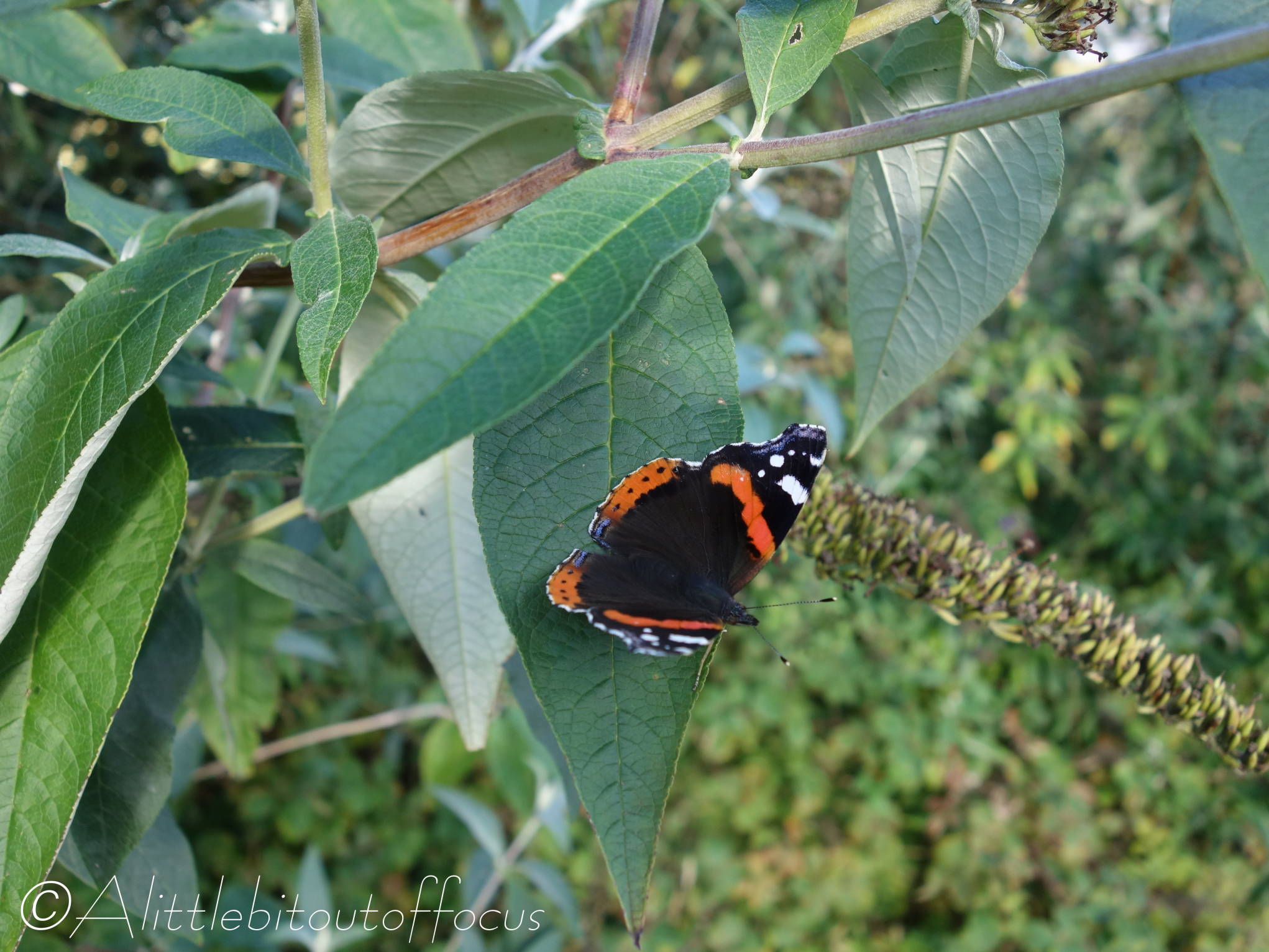 Anyway, I’ve mentioned (I think) in a previous post how many buddleia bushes there are dotted around the area and I was bemoaning the fact that the butterflies always seemed to fly by and dismiss those in our garden as ‘same old, same old’. However, I didn’t know that they flowered again in the autumn and for the past few days our biggest bush has been awash with Red Admirals (vanessa atalanta) – sometimes 7 or 8 at a time. I’ve seen other butterflies too, but only managed to capture a Painted Lady (vanessa cardui).