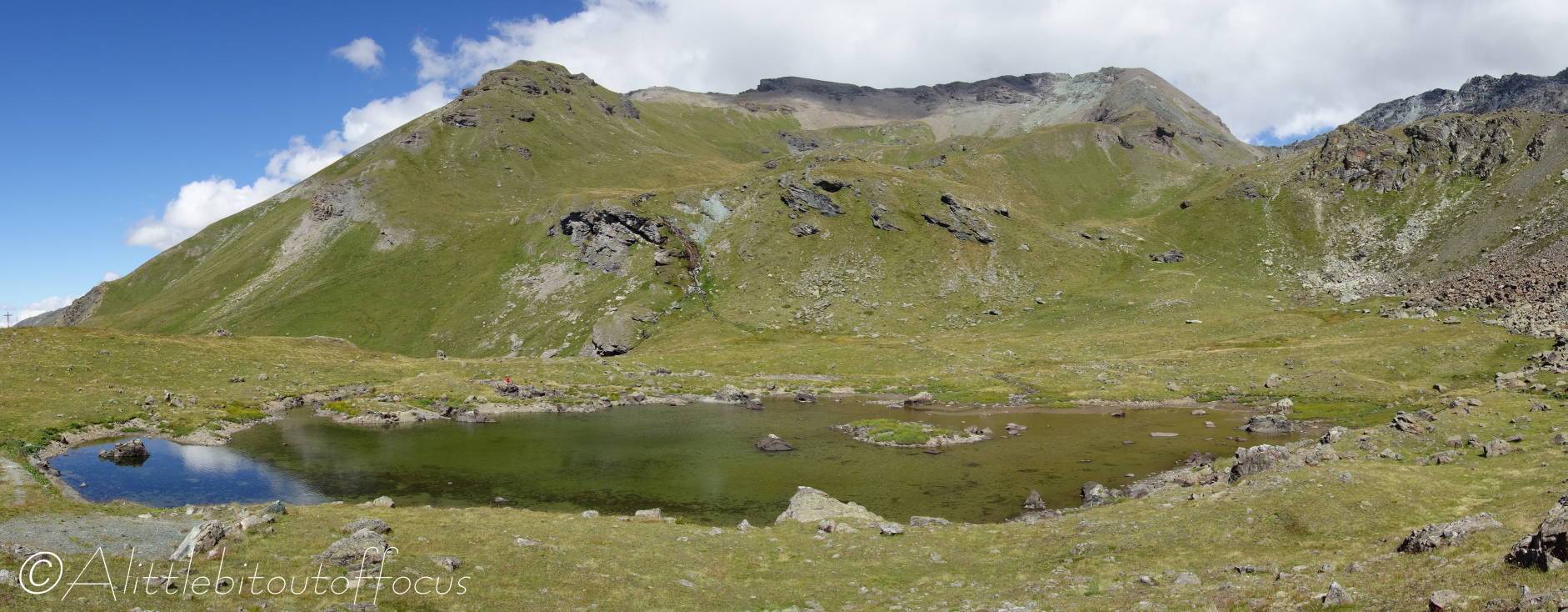 At the col there is a signpost, but the way down is clear… (to the left as you approached the col). As you descend, you will see a small lake at the Remointse de Tsaté. The lake is well worth a very short detour.