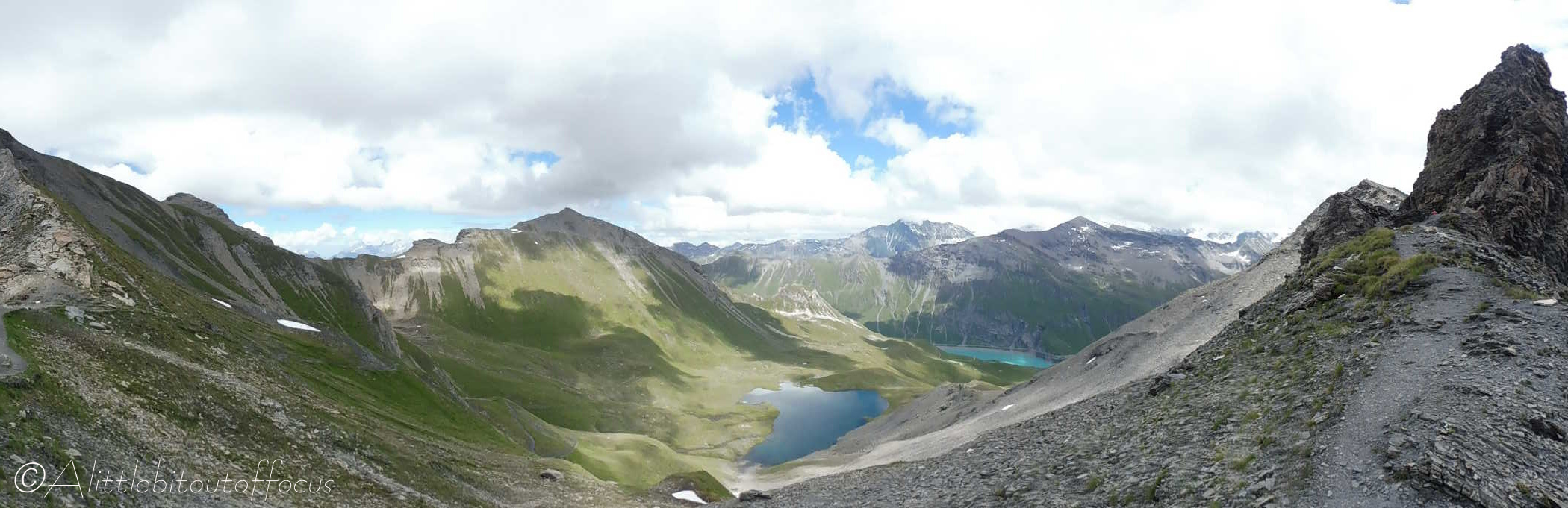 The descent path continues off and slightly to the right and passes to the left of some avalanche metalwork. From here you pass a temporary building to the left (if it’s still there) and you will see a ridge falling away directly in front. follow this ridge down for maybe 400metres before turning left along a path which zig-zags down to a small lake, called Lac du Tsaté. Turn right and follow the path down to the farm buildings at Remointse du Tsaté.