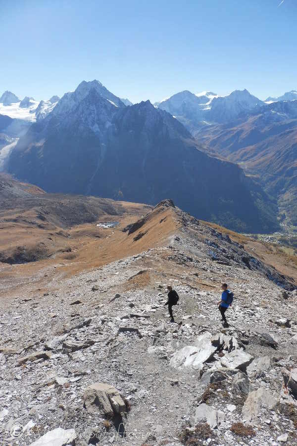 If the distance and/or height gain seem overwhelming, then an easier alternative is to start from Villa (perhaps after taking the postbus) and finish either there (by walking up the road from La Sage), or continue down to Evolène as described.