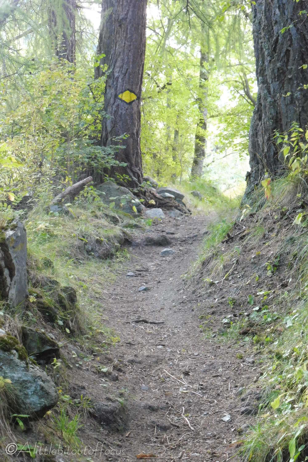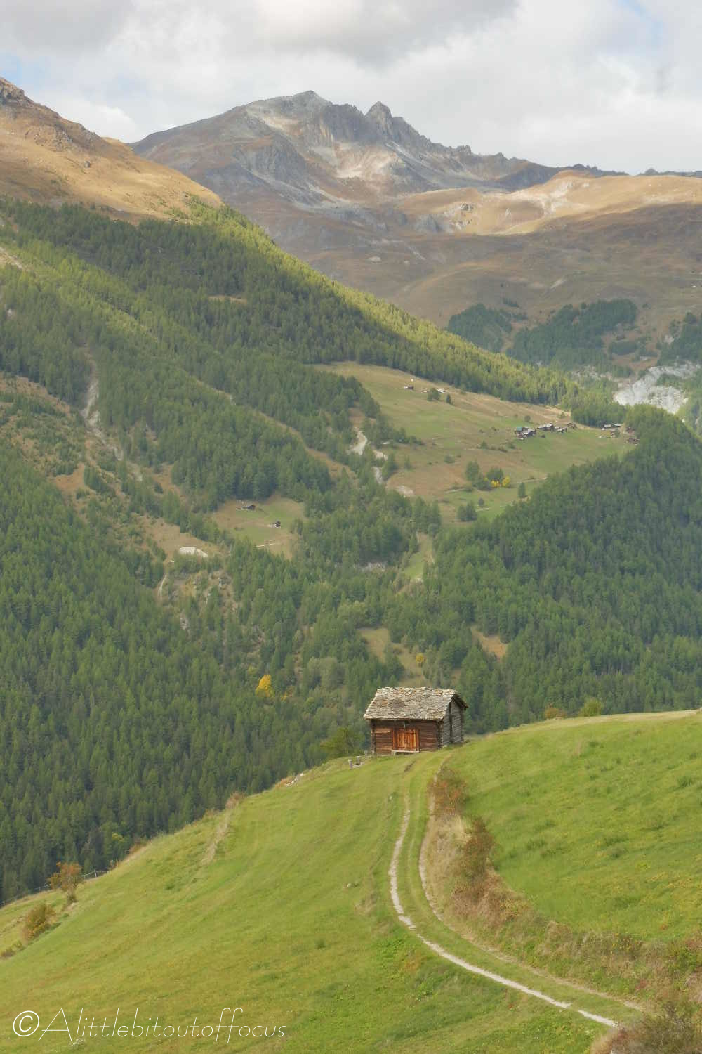 At the village road, turn right for 15m and then turn left at a huge signpost. The track ascends steeply, passing through some chalets. After zig-zagging left-right-left the track passes a few more chalets on the left before bending to the right. Straight ahead you will see a stream coming down. Keep to the right of the stream and up a path which crosses a wooden (single plank) bridge (see pic 4) and ascends again to the left. Soon you will reach a signpost. Turn right here towards the Mayens de Cotter / Col du Torrent (and National Walking Route 6). The path climbs to a single chalet overlooking the valley and meets a wide track. Turn right then immediately left here and traverse across a wide open meadow. The path bends to the left and climbs to 8 or 9 buildings at Mayens de Cotter. - Mayens de Cotter