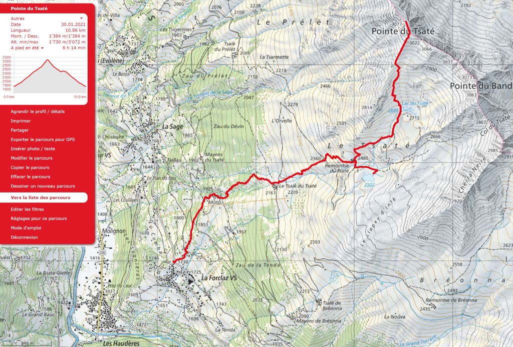 After another 500m you reach La du Tsaté (on your right). Continue upwards to the left and after another steep climb (and approx. 500m) you will reach a sort of ridge. Follow this ridge up and to the right of a temporary worker’s hut (if still there) and some avalanche metalwork, to the Pointe du Tsaté. - Pointe du Tsaté