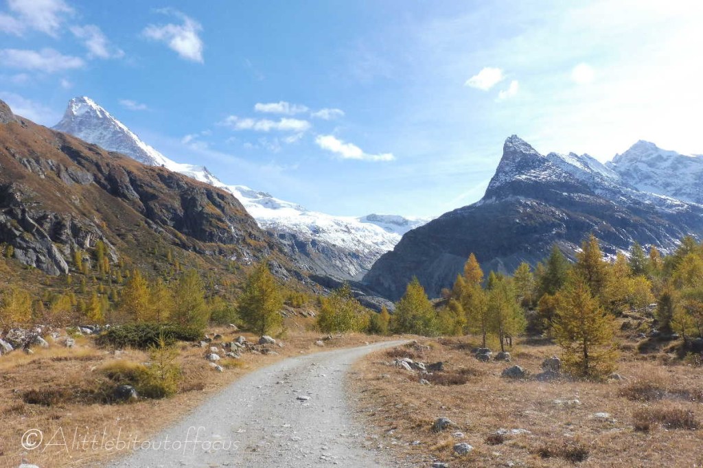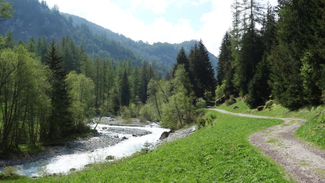 For a little variation and height gain of around 40m, there is a slightly higher path on the far/west side of the river which starts or finishes near the second bridge from either end and gives a wonderful view over Les Haudères and of the Dent Blanche.