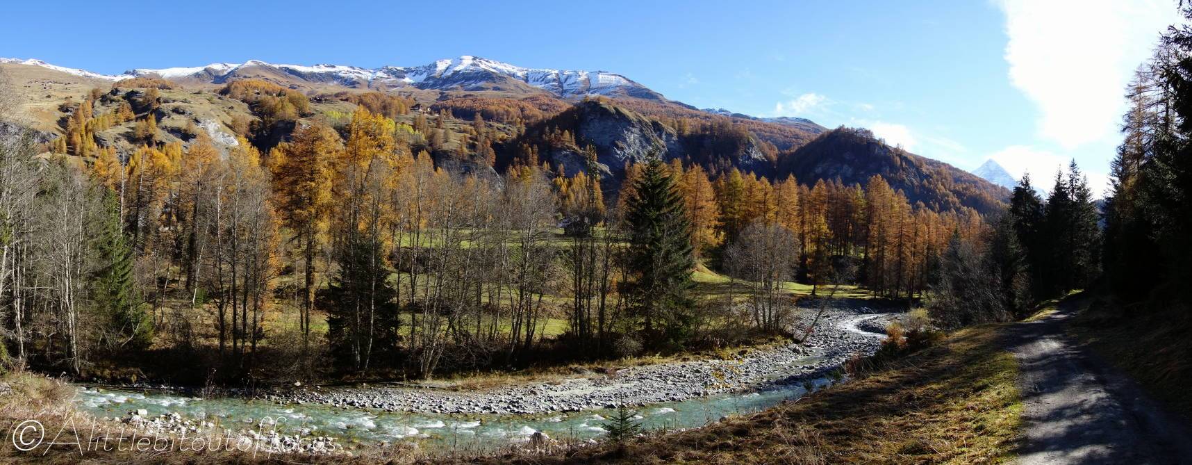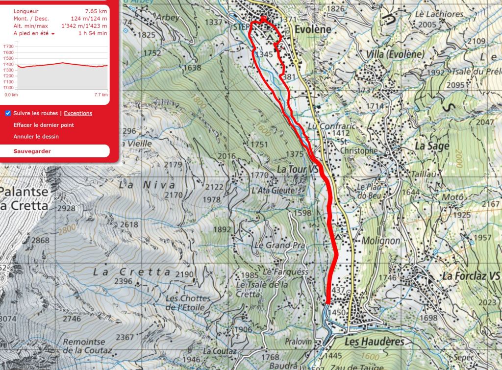 This describes the full walk from Evolène to Les Haudères and back again, but there are much shorter options available by crossing either of the 2 bridges along the way.
