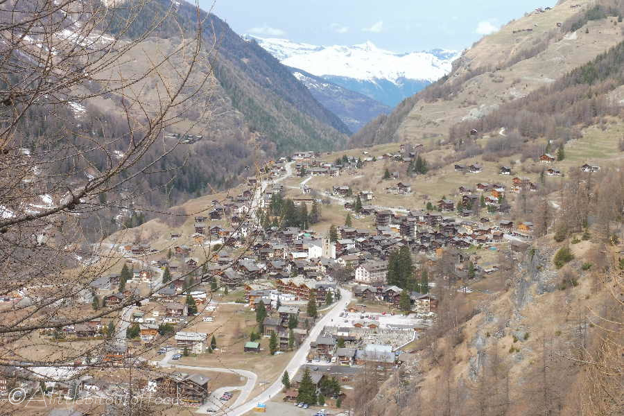 At the far end of the small car park, go left then descend to the right to the lower/main part of the village. Look out for a narrow gap on the left, between a wooden raccard and a small house, where there’s a hand-made wooden sign indicating the way down to Les Haudères (also called Chemin de Zerman). Follow this down quite steeply and then turn right at a track.