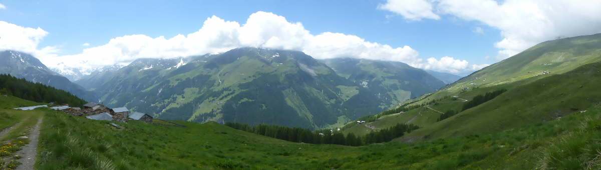 Turn right along the good track and follow it past a group of chalets (at Lè Lachiores). Take the left hand fork at a sign and continue along towards another group of chalets at Le Prelet. Turn left at the signpost and climb up again before traversing across until it meets a wide track. Turn right here and follow the track, or go straight on and cut the corner, turning left at the track to some chalets and a signpost at Le Tsaté. - Le Tsaté