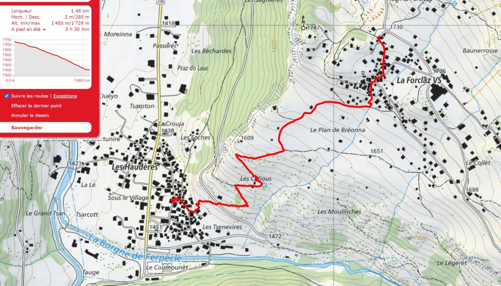 From there the route is fairly clear, as it goes down to the left (passing a few small renovated raccards on the right). As the track begins to level out, it meets a track coming in from the left and a small signpost indicating to turn right. The path continue to descend, turning left then right and goes between 2 small chalets. Quite soon you will see a signpost, here you can continue straight on (to Les Foches) or take the left hand turn (as per the map below). Both options take you straight across the main road (take care) before the paths drop into Les Haudères.