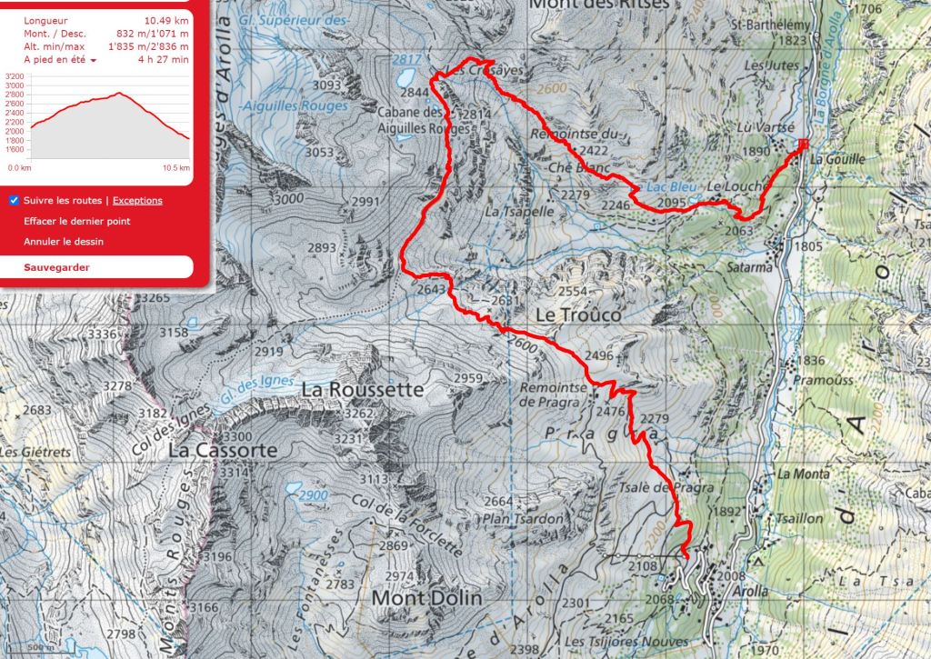 The start point for this walk is the small car park just above the Arolla village*, though it can be done from the village square if catching the bus – simply walk up the road to the parking area. It finishes in La Gouille, but it is possible to walk back to Arolla, either retracing your steps from the hut, or by taking the undulating path from Lac Bleu. Alternatively, and perhaps the best car option, is to time it so that you park your car at La Gouille and then catch the bus up to Arolla.
