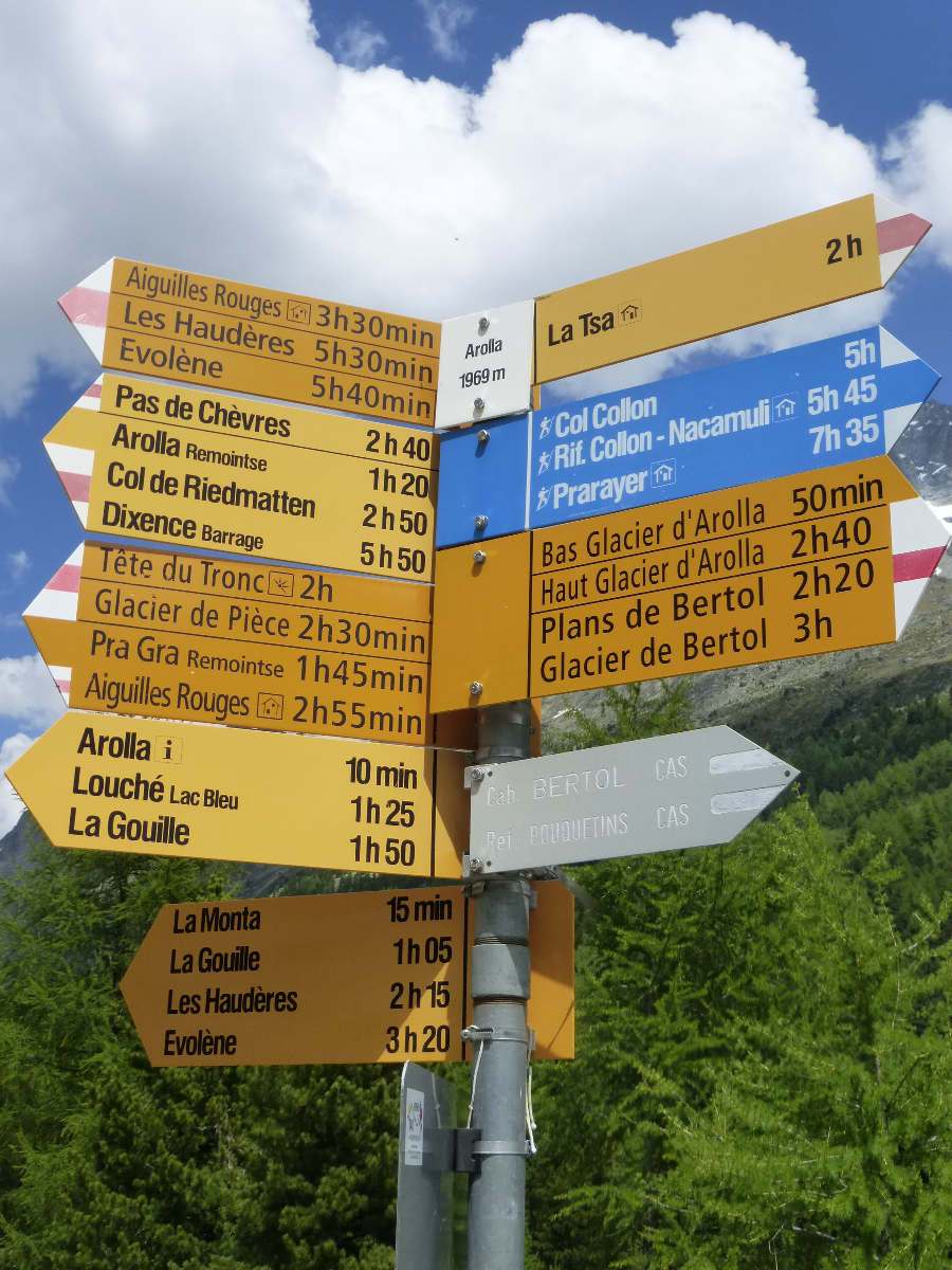 Walk up the track which runs parallel with the road and cross over the road to take the path opposite (and slightly to the right). This path rises for around 60 metres, before bending to the left (with another path coming in from the right). Follow this path as it rises up to Arolla.